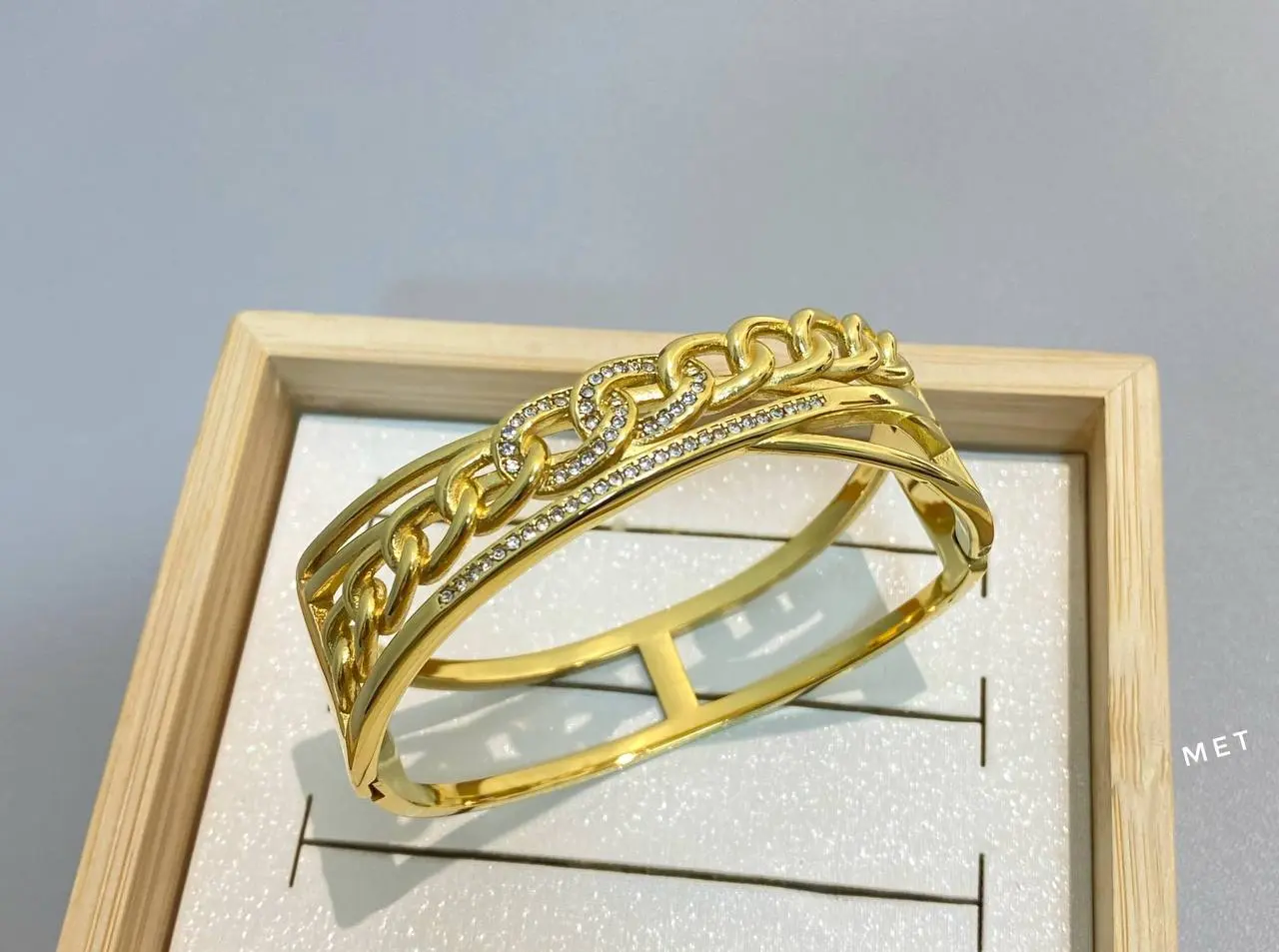 Combines the structure of a bangle with the look of a chunky chain bracelet.