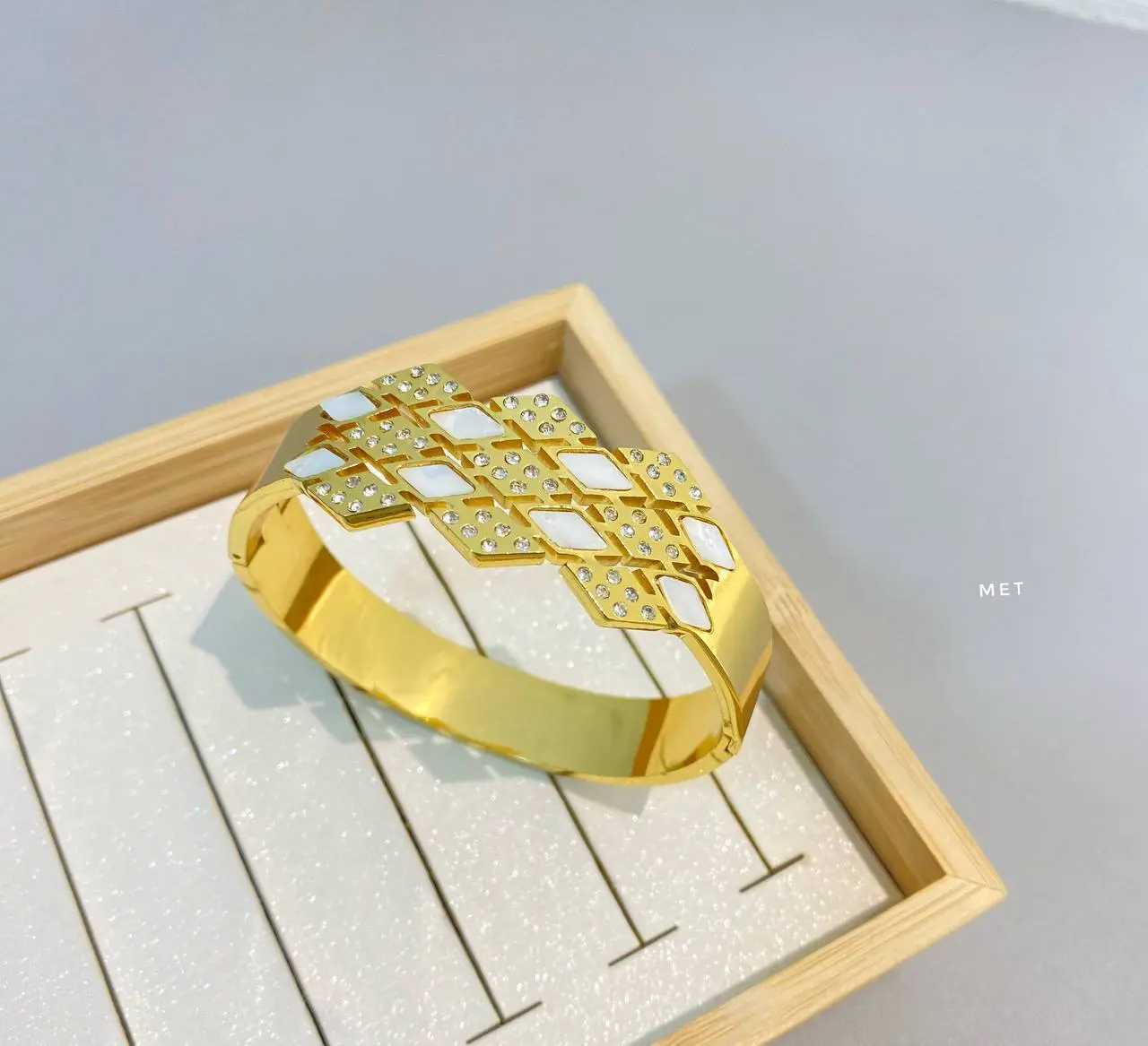 Showcase modern texture with the Gold Plated Honeycomb Pattern Pave Bangle, a sophisticated and guaranteed quality piece from the Beauty Planet Collection. This wide cuff bracelet features a bright, highly polished gold-toned surface. The design highlights a broad, textured band with a distinct honeycomb or scale pattern across the top. The textured area is beautifully framed on its lower edge by a single, precise row of shimmering pave crystals, adding a delicate line of sparkle. Crafted with premium gold plating (Platin), the metal is 100% rust-proof and guaranteed not to change color. This accessory includes an official two-month warranty against color change and manufacturing defects.