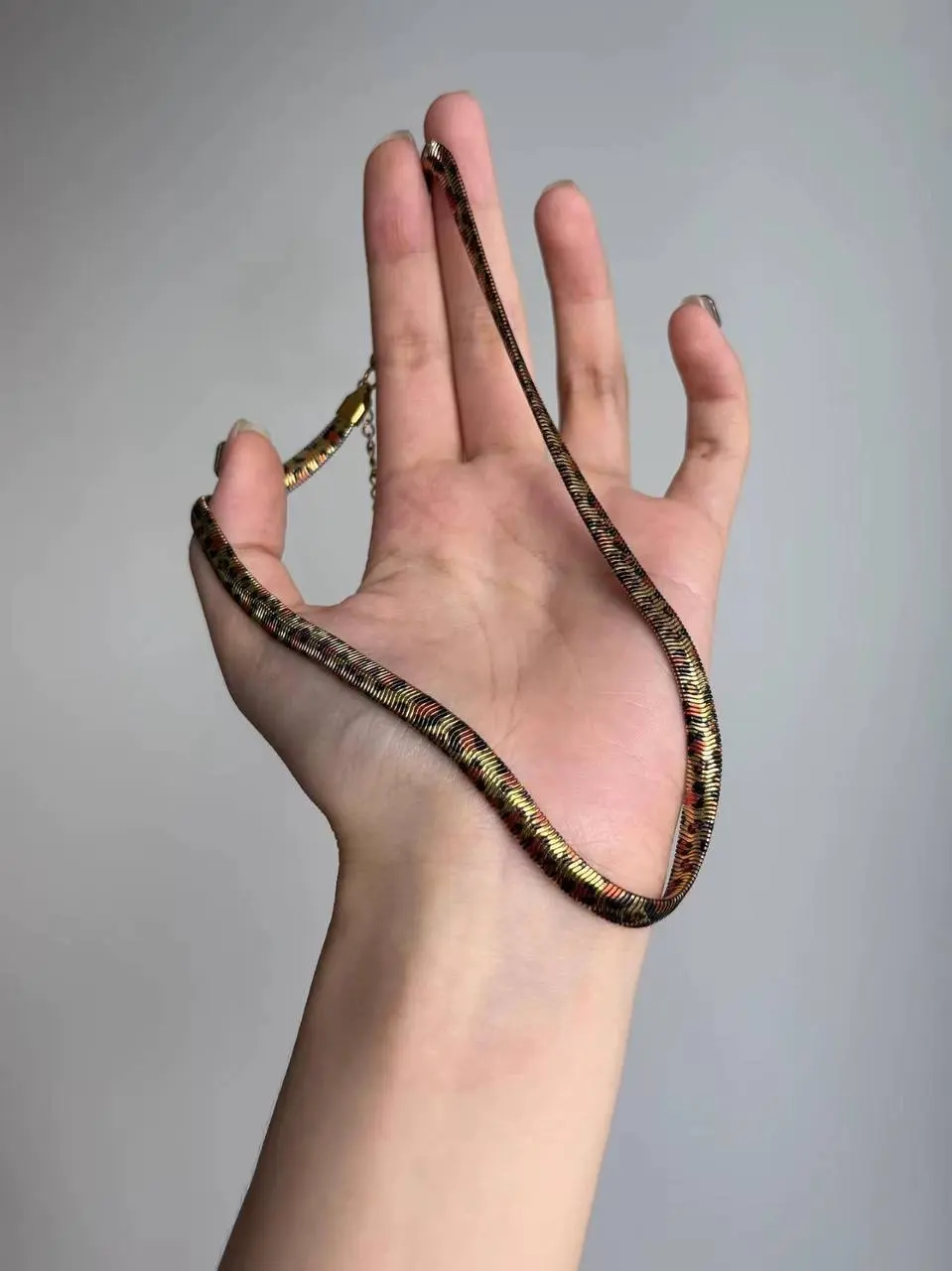 Features a wide, flat, and uniquely fluid chain design (Snake Chain).