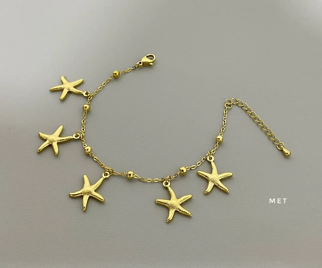 Capture the magic of the ocean with the enchanting Gold Plated Starfish Charm Bracelet, a delicate and guaranteed quality piece from the Beauty Planet Collection. This elegant bracelet features a fine gold-toned bead chain, beautifully adorned with five detailed starfish charms that dangle playfully along the length. Perfect for everyday wear or a summer look, the celestial-nautical design is both chic and whimsical. Crafted with premium gold plating (Platin), the metal is 100% rust-proof and guaranteed not to change color. This accessory includes an official two-month warranty against color change and manufacturing defects.