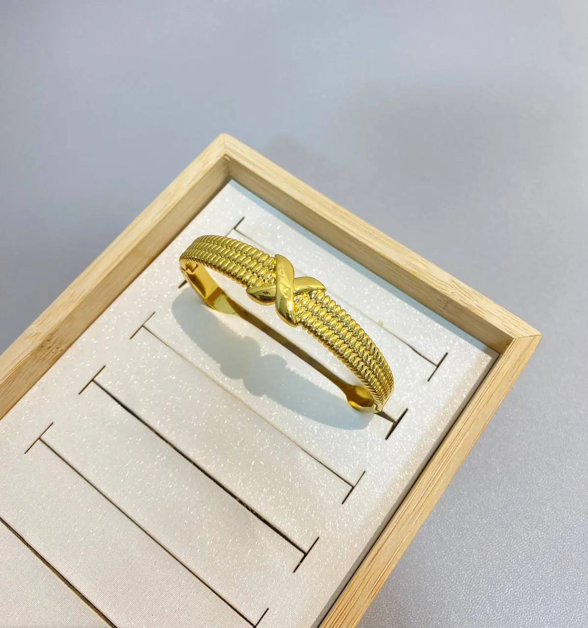 Showcase luxurious texture with the Gold Plated Woven Cuff Bangle with X-Knot Center, a sophisticated and guaranteed quality piece from the Beauty Planet Collection. This wide cuff bracelet features a striking, polished gold-toned surface. The body of the cuff is intricately detailed with a rich woven or basketweave texture, giving it depth and a high-end feel. A prominent X-shaped crossover knot sits centrally on the cuff, providing a focal point and a modern structural element. Crafted with premium gold plating (Platin), the metal is 100% rust-proof and guaranteed not to change color. This accessory includes an official two-month warranty against color change and manufacturing defects.