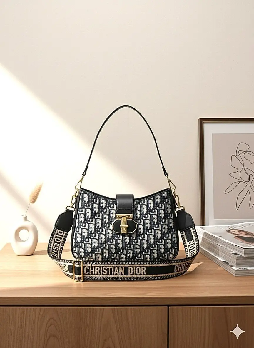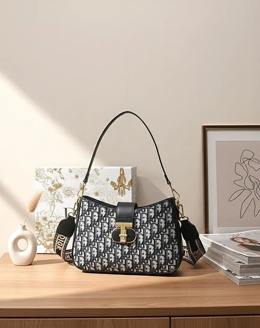 Step out in timeless style with this luxurious, European-imported shoulder bag. Featuring a sophisticated classic shape and adorned with an elegant all-over Monogram pattern, this bag is a true statement piece. It boasts a premium metallic T-lock closure, structured black leather trim, and offers dual carrying options: a sleek, adjustable shoulder strap and a detachable wide, patterned webbing strap for a contemporary look. This highly refined accessory is the definition of everyday luxury, exclusively curated by Beauty Planet.
