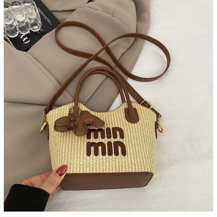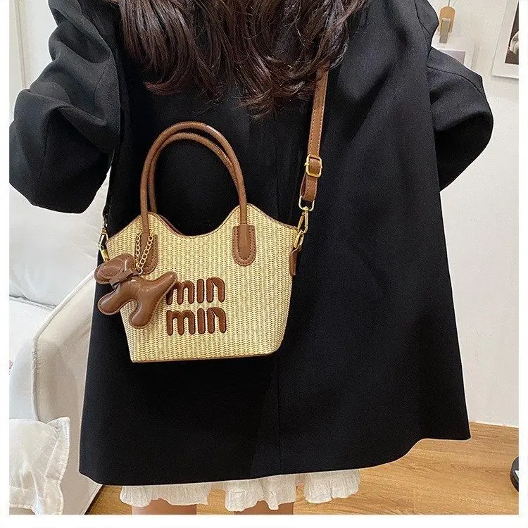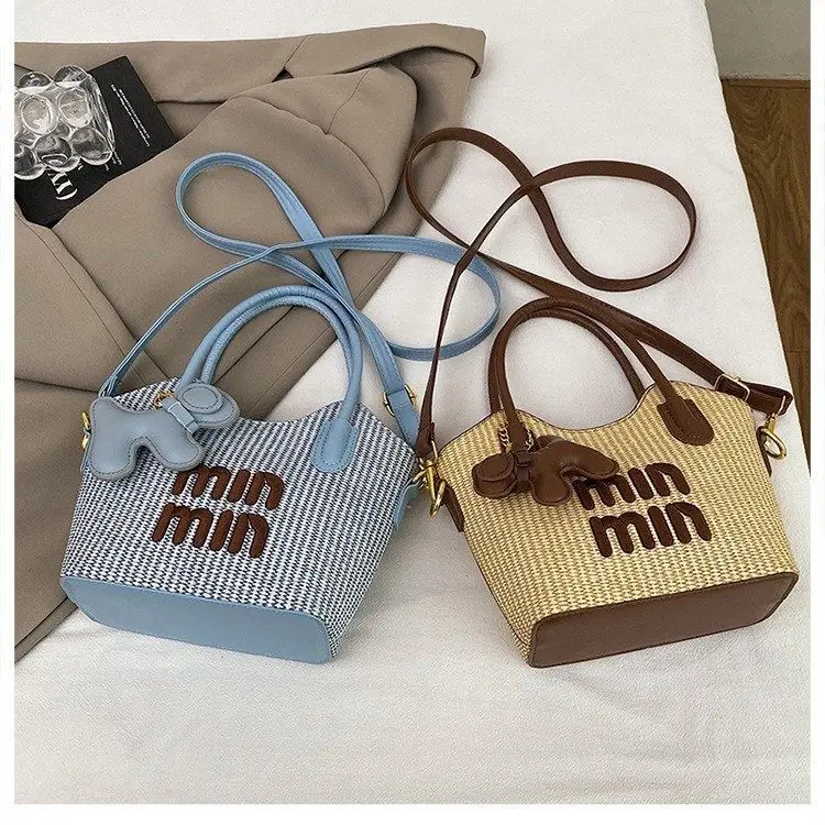 Add a touch of playful elegance to your wardrobe with our Miu Miu inspired woven mini bag. This charming accessory features a textured woven body and playful 3D “min min” branding, offering a fresh and trendy take on the classic bucket bag silhouette.