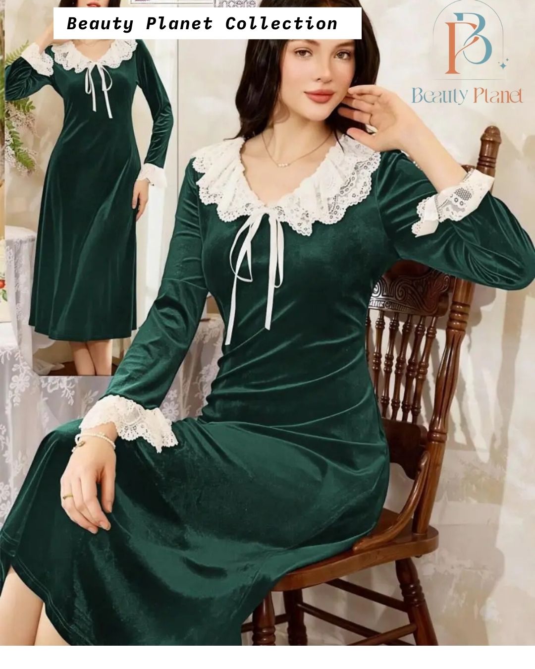 Experience true old-world glamour and comfort with the ‘Emerald Victorian’ Nightgown, an exquisite piece from beautyPlanet. This elegant full-length gown is crafted to make you feel regal while you rest. Its blend of classic velvet and delicate lace speaks to the European Imported Quality used in its creation, offering a truly luxurious sleepwear experience.